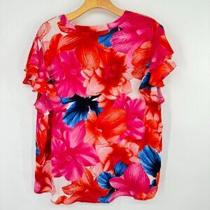 Tacera blouse Womens size XL Red Pink floral Short Sleeve v neck flutter