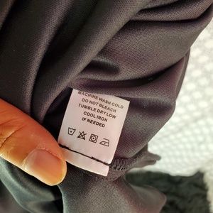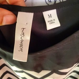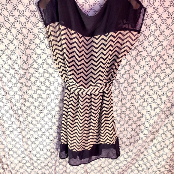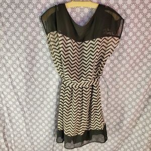 Tacera Tan Dress with black zigzag stripe. Black shoulder and trim mid-length. size Medium
