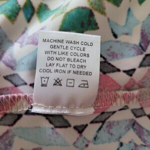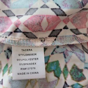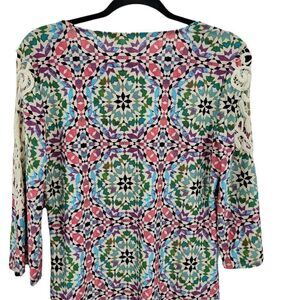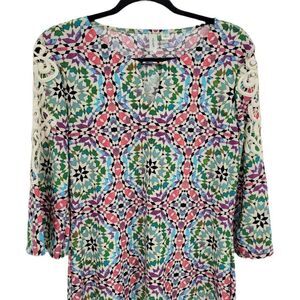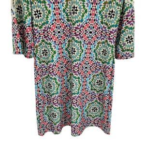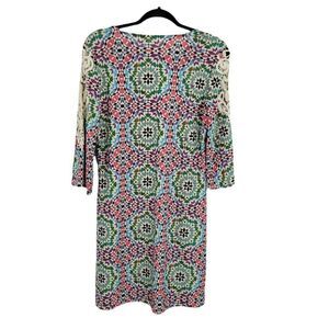 Retro 70's glam multicolor kaleidoscope print 3/4 crochet lace angel sleeve keyhole scoop neck tea length shift dress by Tacera.