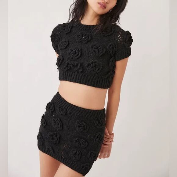 Tags- skirt set, knit skirt set, woven skirt set, coordinating set, crochet set, crop top mini skirt set, revolve matching skirt top sets, free people knit sets, vacation outfit, date night outfit, influencer fave, blogger fave, tach clothing matching set, tach clothing black knit mini skirt crop top set, tach clothing polina top elena skirt crochet knit black rosette mini skirt crop top coordinating set