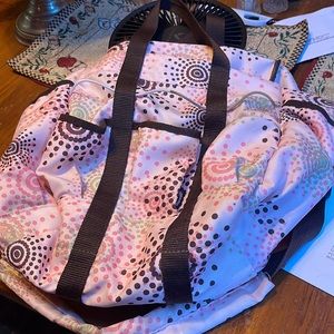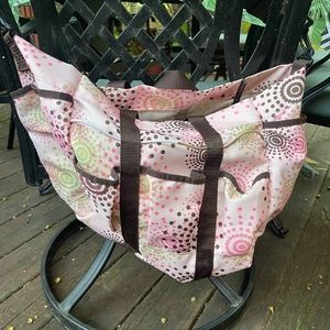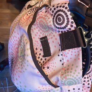 This is a pink grooming tools tack bag. Hardly used and very clean. Lots of panels with elastic keepers to hold tools in. 3 small pockets on the front 2 large pockets on each side . 2 large pockets on either side inside. Spacious bottom of bag. Also has 2 short handles and an over the shoulder padded strap. Any young (or older) person would feel special walking into the barn or anywhere with this convenient over the shoulder tack bag . Laying flat it measures 16” across the middle tapering down to 12” across the bottom 12” H