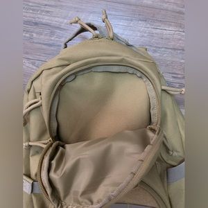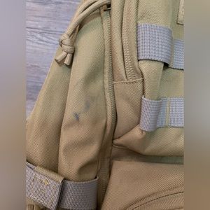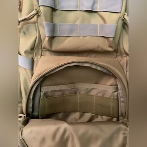 Desert tan type colored tactical backpack. I’m great condition, one slight black mark, unsure what it is, may be able to be steam cleaned off. Has a lot of storage and also 2 spots on top for a camel pack water bag.