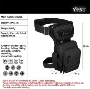 Structure: The tactical fanny pack thigh bag with attached sandwich back, 4 zipped pockets with many compartments as the perfect tool bag. Leg straps can be detachable, waist and leg straps with adjustable snap buckle as lightweight tactical leg pockets