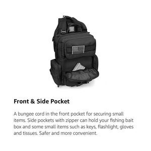 •The tactical sling bag features a large main compartment, 1 holster/back compartment, 2 front pockets, 2 side pockets.