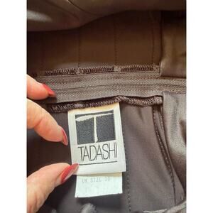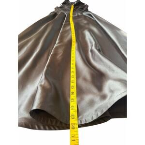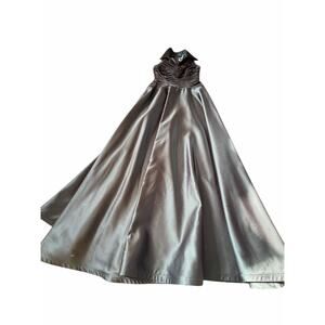 This elegant T by Tadashi formal gown is a stunning statement piece featuring a structured collared neckline, velvet chevron-style bodice, and a sleek, flowing A-line satin skirt. The top showcases rich textured velvet paneling with slimming vertical and V-shaped lines that create a beautifully contoured silhouette. The dress is in excellent condition and includes a back zip closure, a full-length skirt with gorgeous movement, and a smooth inner lining for comfort. This is a truly timeless and dramatic evening gown perfect for galas, weddings, black-tie events, or formal celebrations.