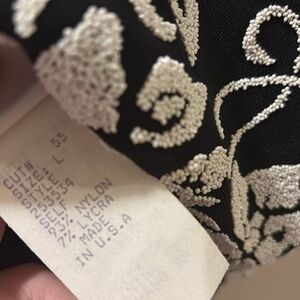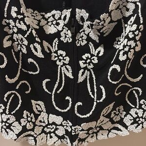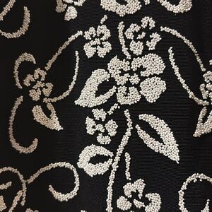 This stunning bodysuit by Tadashi Shoji features a striking black and white design, enhanced with intricate embellishments. The fitted silhouette is complemented by a high low style and a sophisticated Mandarin collar, making it a perfect choice for elegant occasions.