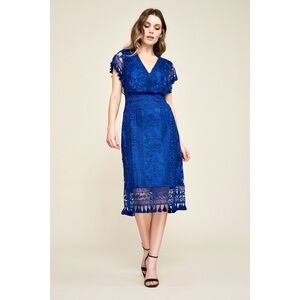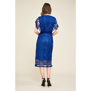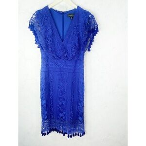 Tadashi Shoji Brooklyn Embroidered Tassel Dress. Low-cut Arm Holes. Crisscrossing V-Neck. Lace Tassel-Trimmed Cap Sleeves. Embroidery Design Allover. Blue / Dark Purple Color. Super Cute & Comfy. NWT / New W Tags. Great Condition. No Stains or Rips.