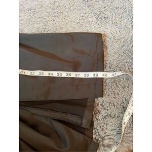 No flaws. Has the gathered front. Back zip closure. Knee length with the slit on the front as well. Would be a great wedding guest or mother of the bride dress.