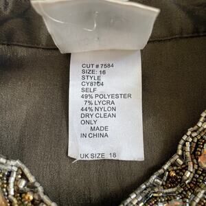 Elevate your wardrobe with this elegant Tadashi Brown Beaded Trim Ruched Cropped Jacket, Size 16 (US). Crafted from a luxurious blend of polyester, lycra, and nylon, this jacket features exquisite beaded trim detailing and flattering ruching for a sophisticated look. Perfect for special occasions or stylish layering, it measures 23.5" long with a comfortable fit. Worn only once and in excellent condition, this imported jacket requires dry cleaning to maintain its quality.