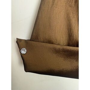 This evening jacket is sort of a brown metallic, with three quarter sleeves that have a faux diamond detail. There is a reverse zipper up the back! Different but classic. Excellent used condition.