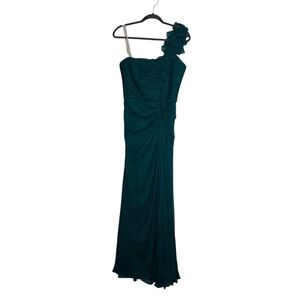 Chic one-shoulder design with floral accent. Rich green hue. Perfect for elegant events.