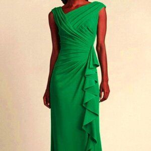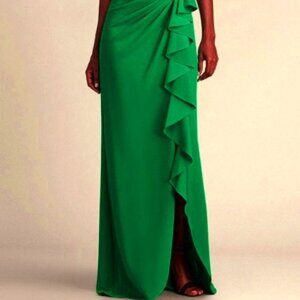 Softly pleated details and a cascading ruffle animate a verdant gown designed with a side slit to accomodate your dance moves.