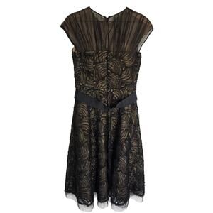 This stunning Tadashi Shoji dress features a sheer illusion neckline, cap sleeves, metallic gold underlay with black lace overlay, and a flattering belted waist. Perfect for weddings, cocktail parties, formal dinners, or holiday events.