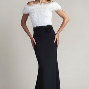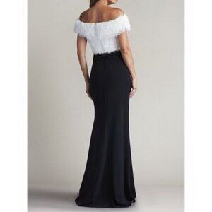 Tadashi Shoji Black Ivory Jana Eyelash Yarn And Crepe Gown
