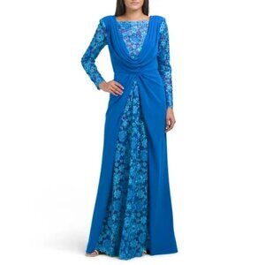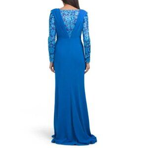 Tadashi Shoji Blue Gaze Emroidered Lace Long Sleeve Crepe Gown