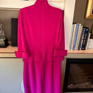 This beautiful designer-lined below-the-knee dress has stunning details: a collar, a Peplum, and Cuffs. It is perfect for a cocktail, a Gala, or an MOB.