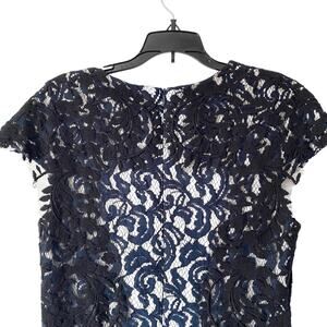 Tadashi Shoji Contrast Embroidered Lace Panel Dress size 12 Blue Black in excellent condition. Measurements laying flat chest 19 1/2 inches across and waist 16 inches across and length 43 inches long
