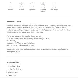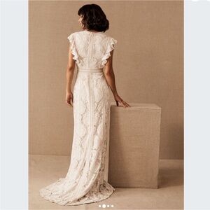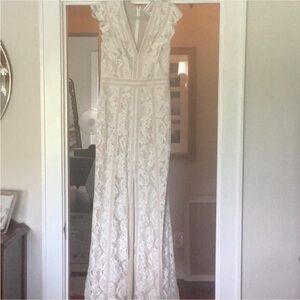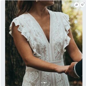 Elegant cream lace dress. Features a deep V-neck and flutter sleeves. High slit for a modern touch.