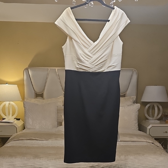 Chic midi dress with a white bodice and black skirt. Ideal for elegant occasions.