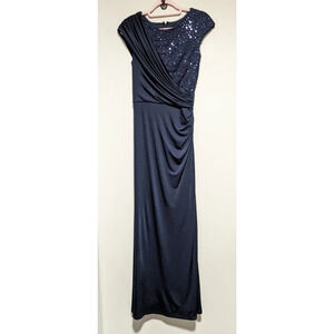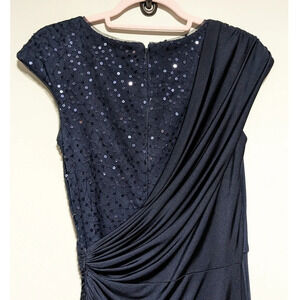 Definitive of Tadashi Shoji, this glittering gown boasts his signature curve-defining style. Sequins shine on the top half and the fabric wraps around the body and then falls into a glamorous drape. Side zipper and center back zipper