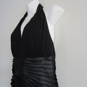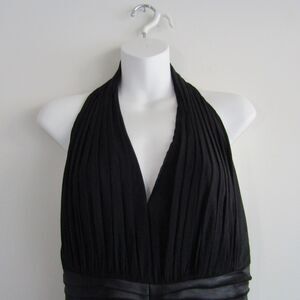 Tadashi Shoji women's vintage dress - A-line silhouette, midi, pleated satin bodice, halter neckline, sheer skirt back zipper closure and fully lined. Black.