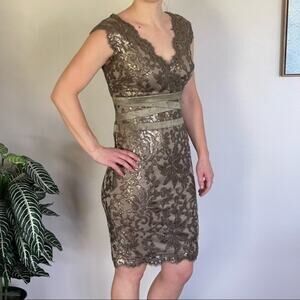 Tadashi Shoji Antique Gold Sequin Sheer Lace BodyCon Party Event Dress