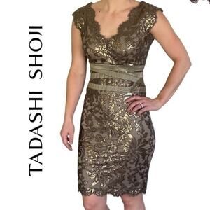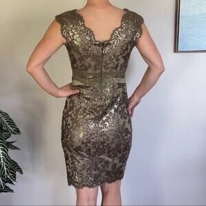 Tadashi Shoji Antique Gold Sequin Sheer Lace BodyCon Party Event Dress