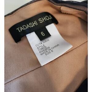 Stunning Tadashi Shoji full length navy blue gown. Pleated faux wrap style front is navy over nude fabric. Dramatic low cut v-neck. Skirt features 3-d textured fabric design over a mesh fabric. Flowy skirt.