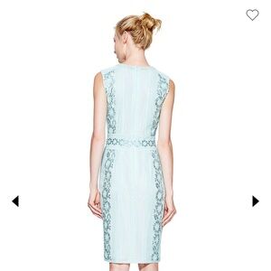 This Tadashi Shoji dress in a stunning green hue is perfect for cocktail events or as a wedding guest. The sleeveless sheath design features a crew neckline and a midi length, offering a sophisticated and elegant silhouette. Intricate lace detailing adds a touch of femininity and charm to this timeless piece.
