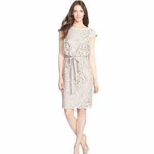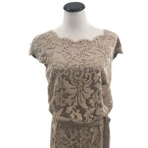 A beautifully tailored sheath that's perfect for any event. Dainty cap sleeves and a slightly scooped boatneck flatter arms and shoulders while a grosgrain ribbon sash subtly defines the waist and accents the blouson. Lined. Zips up the back and has clear tiny snaps to keep the fabric over the zipper. Polyester / nylon blend. Dry clean only. In preowned condition, some minor loose threads / wear throughout.