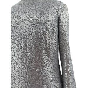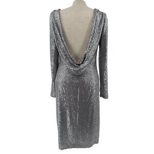 Tadashi Shoji Long-Sleeve Sequined Silver Midi Dress Draped Back Detail Size M