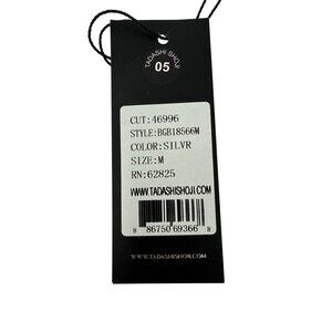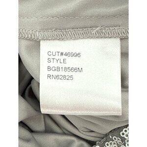 This elegant Tadashi Shoji silver dress features long sleeves, a sequined design, and a sophisticated draped back. Ideal for formal settings, its refined style offers timeless appeal.
