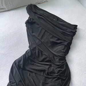 This flattering size Large dress features a dramatic one-shoulder design that showcases your collarbone and adds a touch of modern flair.