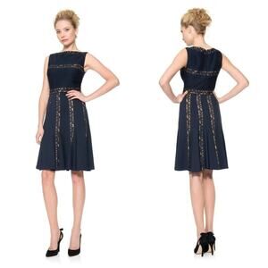 Step into elegance with this stunning Tadashi Shoji navy blue fit and flare dress, perfect for weddings, cocktail parties, or any special event. The flattering silhouette features a pleated bodice and vertical lace insets throughout the flared skirt, creating a timeless, feminine shape that moves beautifully.