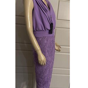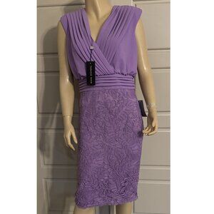 Sophisticated and timeless, this lace cocktail dress features a flattering blouson bodice and delicate pleated V-neckline, along with a sleeveless design that beautifully complements your figure. The intricate corded embroidery adds an elegant touch, making this dress an ideal choice for any special occasion. Center back invisible zipper. Lined. • Approx. Length from High Point Shoulder to Hem is 40” • Dry Clean • Imported Approximate measurements while the dress laying flat in inches         Bust : 17 inches ( 34 inches Bust around)      Waist :  14 Inches.( 28 Inches Waist around). Approx. length from shoulder to hem 40 inches (Front). (BOX # 110 P)
