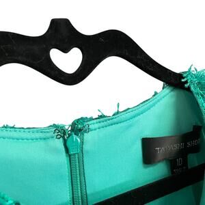 • Features: Sleeveless, Zip up back with hook and eye closure, Lined, Jasmine green, Fringe and sequin detail, Fit and flare style, Past knee length