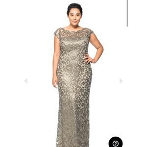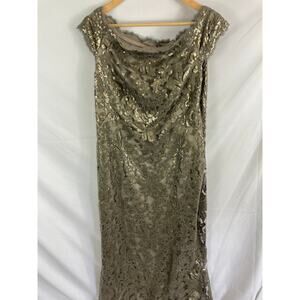 Tadashi Shoji Pailette Embroidered Lace Off Shoulder Gown