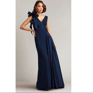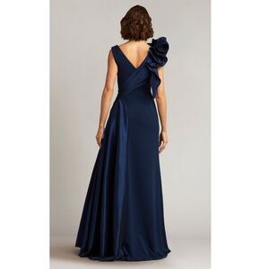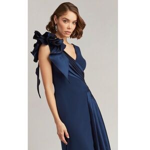 Bewitch with timeless romance in the Tadashi Shoji BOS23030L masterpiece. This captivating gown flatters the figure with a classic A-line silhouette. Delicate ruching adorns the v-neckline and bodice, while a whimsical ruffled rosette adds a touch of textural intrigue at the shoulder. The v-open back ensures a hint of sophisticated drama, and the skirt cascades gracefully into a floor-length hem. Ideal for grand ballrooms, weddings, or any black-tie affair, the Tadashi Shoji BOS23030L creation guarantees you'll be a vision of unforgettable grace. Models are wearing the Cadet Blue and Navy colors.