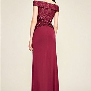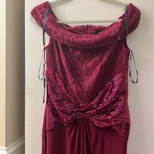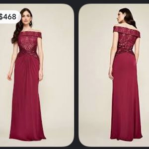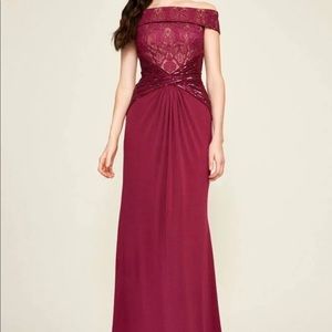 Tadashi Shoji Sangria maroon fuchsia cranberry off the shoulder evening gown