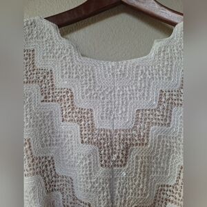 The intricately pieced bodice of crochet-sequin knit and crepe gown flawlessly accentuates your figure. The floor-length crepe skirt pairs effortlessly with the fitted bodice to create a look that at once is stylish and sophisticated. Highlights include a leatherette waistband, shaped cutwork on the edging of the cap sleeves, and an invisible zipper closure at the center back. Fully lined in our signature stretch knit jersey. Womens size 10. Pit to pit flat lay 17.5" length from top of shoulder to hem (front) 58" measurements are approximate