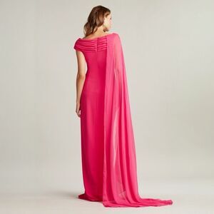 Cape like chiffon sleeve that extends past the hem into a floor grazing train