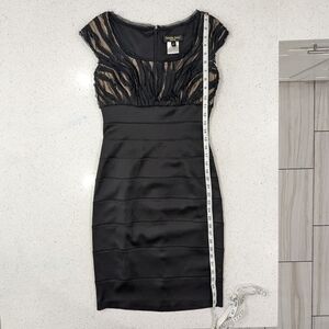 Tadashi Shoji Women Silk Blend Black Dress with Nude Lining Top, Sheath/BodyCon Style, Short Cap Sleeves, Round Neck, Mesh and Sequin Details, Back Zipper for Closure. Above Knee Length.