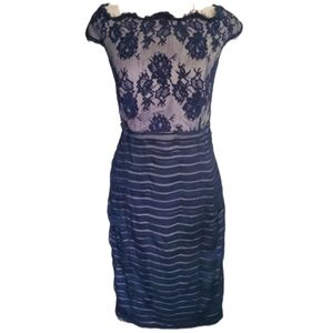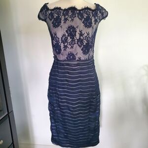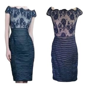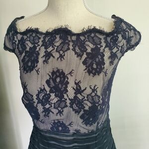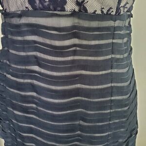 Tadashi Shoji gray silk dress with deep navy lace overlay, wavy neckline and back zipper.