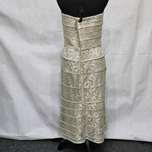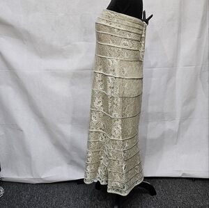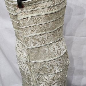 Strapless, bust supporting elastic, see thru lace dress, fully lined with nude colored lining. Floral lace pattern and zipper closure up the back. I clamped the dress on the mannequin to hold it on there in pics. 65% Rayon 35% Nylon. size 14