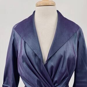 Tadashi Shoji Taffeta Twist Front Blouse Dramatic Wing Collar Slate Blue/ Purple