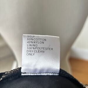 Excellent condition. Black and tan oversize damask style lace illusion overlay. Scalloped high neckline, knee length. Blouson top, drop fitted waist, a-line skirt.