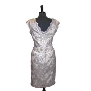 Tadashi Shoji V Neck Sheath Dress Silver Gray Sequin Lace Size 10