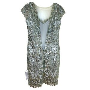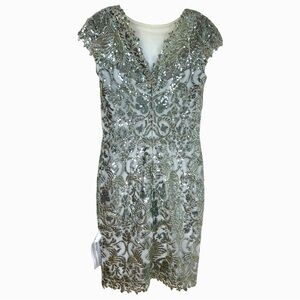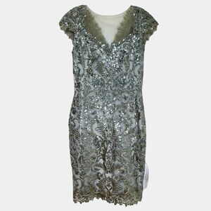 Tadashi Shoji, Womens Sheath Dress, ‘Herschel’ Lace Embroidered Gold/Green, SZ 2