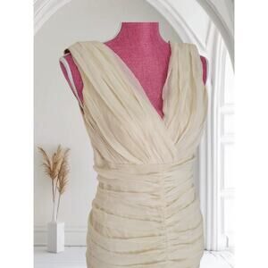 This vintage cream silk ruched sleeveless dress from Tadashi is really beautiful! The ruched silhouette gives it a very flattering fit and we love the double deep wrap v-neck in the front and back. The cream color can really be worn year round when paired with the right accessories and shoes!