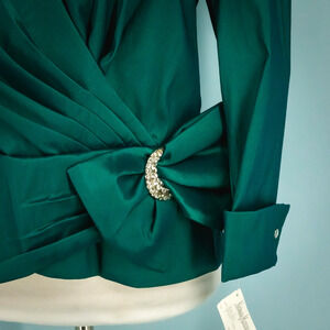 Tadashi Size 12 Green Wrap V Neck Collared Long Sleeve Bow Rhinestone Formal Top